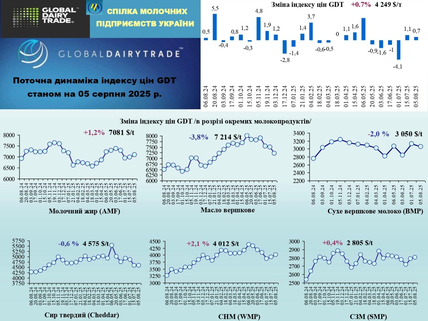 5 серпня на торгах Global Dairy Trade (GDT) індекс цін на молочну продукцію ще трохи зріс ‒ на 0,7% за рахунок незначного зростання цін на сухе молоко (сухе незбиране молоко +2,1% до $4,0 тис; сухе знежирене молоко +0,4% до $2,8 тис) та молочний жир (+1,2 %).