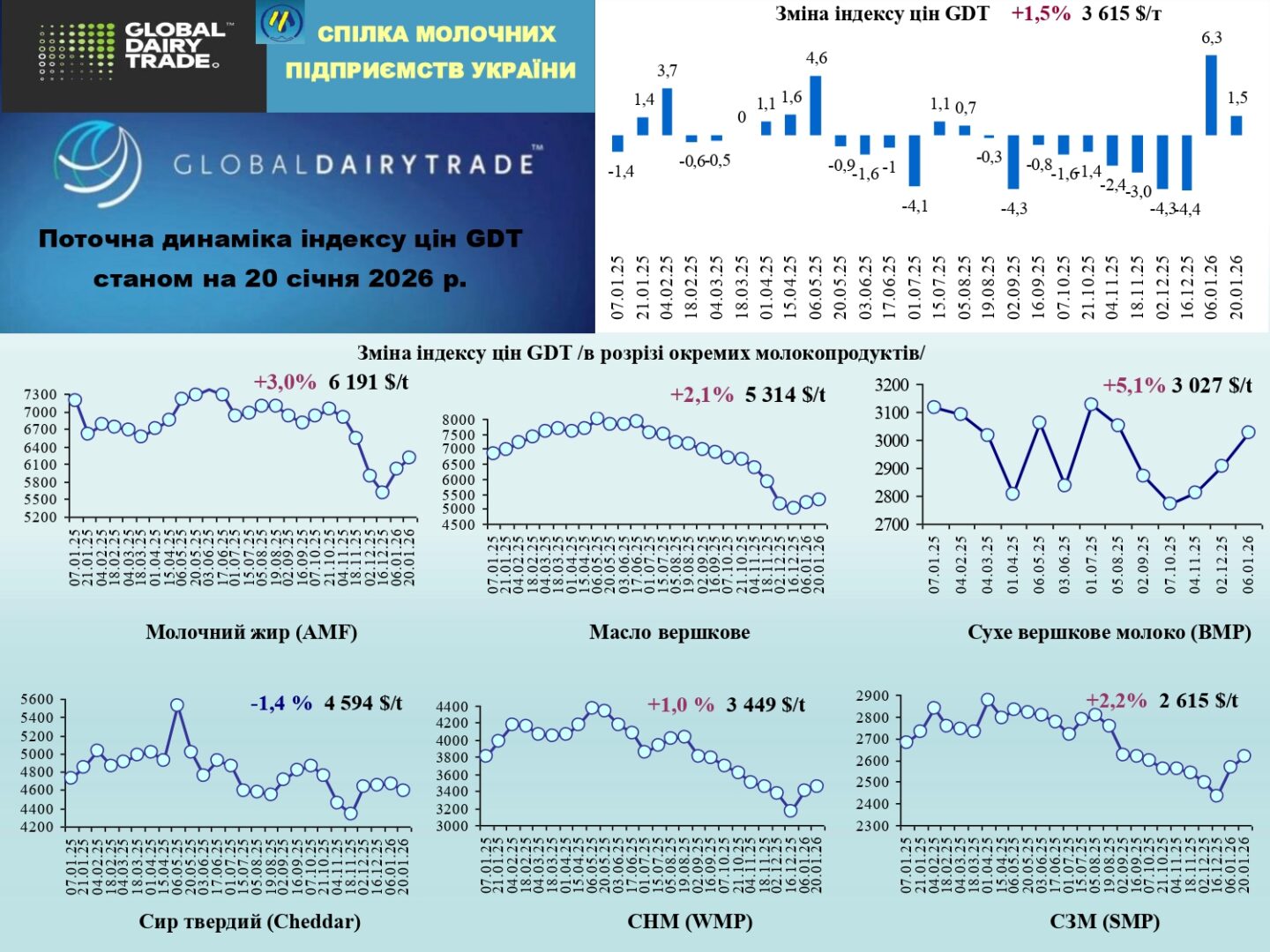 20 січня на торгах Global Dairy Trade (GDT) індекс цін на молочну продукцію зріс на 1,5 %: з $3,53 тис до $3,61 тис. Як зазначає експертно-аналітична служба Спілки молочних підприємств України, це свідчить про помірне відновлення цін на світовому молочному ринку після періоду зниження наприкінці 2025 року.