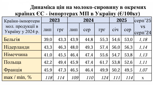 За попередніми оцінками оцінками, у країнах ЄС у серпні-2025 середній рівень цін залишився нижчим €53/100 кг. Ціни залишаються практично незмінними вже півроку – з березня-2025, а суттєво не змінювались з листопада-2024.
